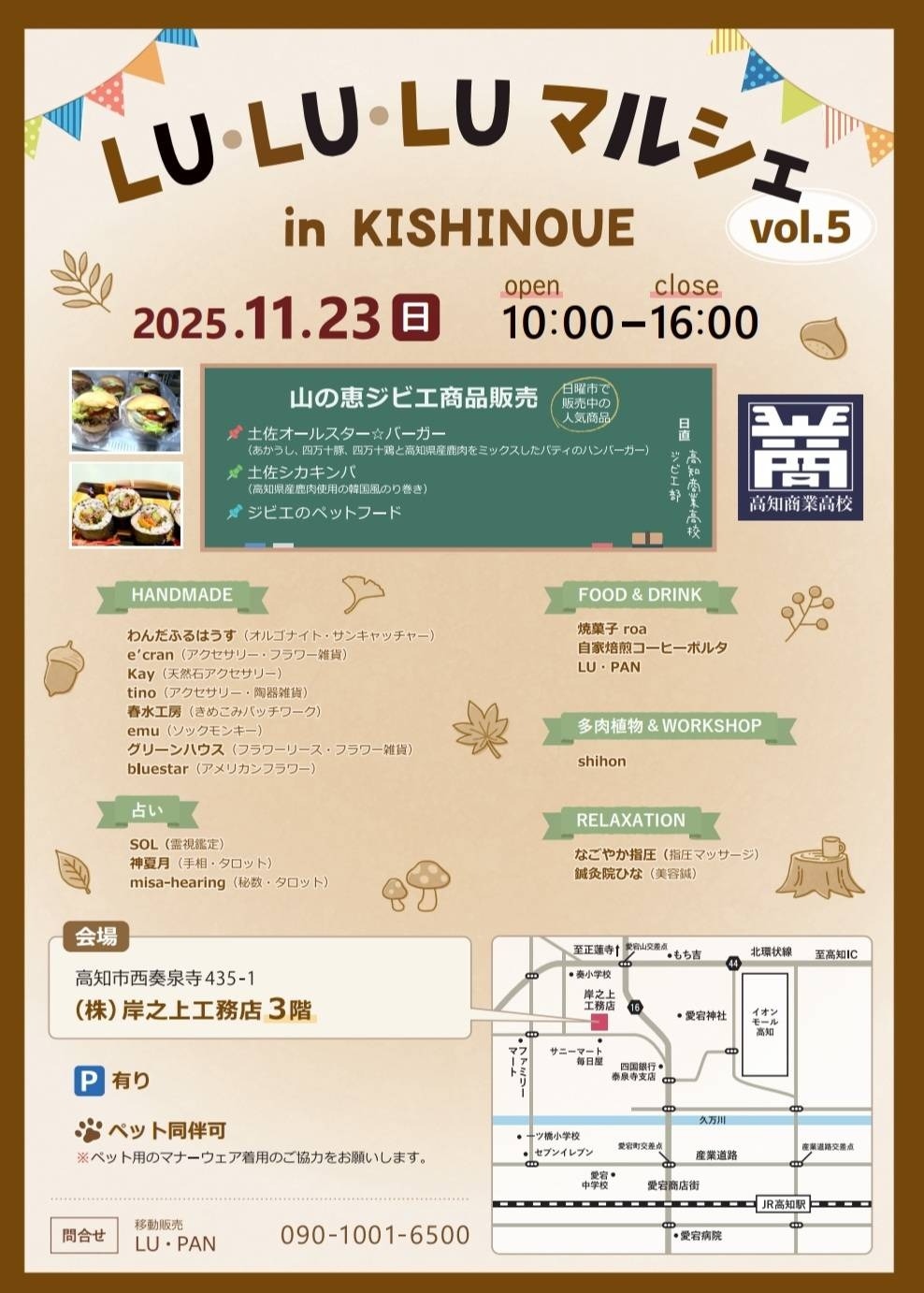 トピックス 2025.10.08 〇2025.11.23.SUN〇LU・LU・LU マルシェ〇当社3Fで開催します! 高知商業高校ジビエ部のみなさんによる、ジビエグルメも販売します*当社でマルシェを開催するのは初めて!みなさんぜひぜひお越しください!