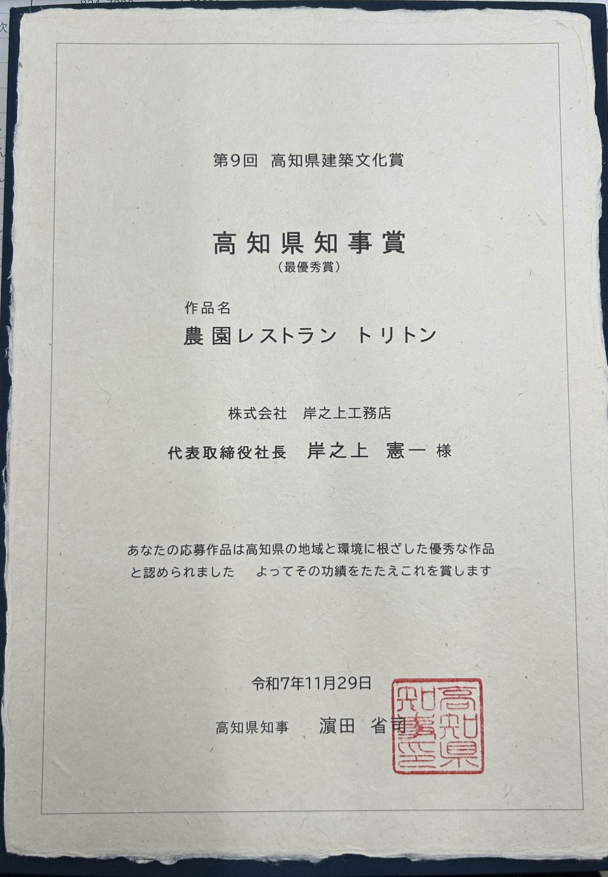 トピックス 2025.12.01 *第9回高知県建築文化賞*農園レストラン トリトン高知県知事賞受賞* 弊社が施工させていただいてから、10年が経過しています。わざわざ足を運びたくなる、子供心を思い出させてくれるような、懐かしくもありわくわくも感じさせてくれるレストラン。たくさんの方に愛されて、今回の賞をいただけたのだと思います。そんな建物を施工させていただけたことが本当に嬉しいですね*